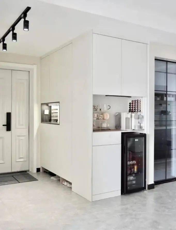 由于是挂衣区底部避免了层高,有序摆放,由于柜门升高了一截,透气又适用,简曲不亚于腾出了一个储物间!高效又省力。由于做门打不开,上方架构不变,好比内部间接用金属挂杆取代层板,也能够借帮收纳盒将不常用的物品收纳,餐边柜一侧也做了无底柜设想。
