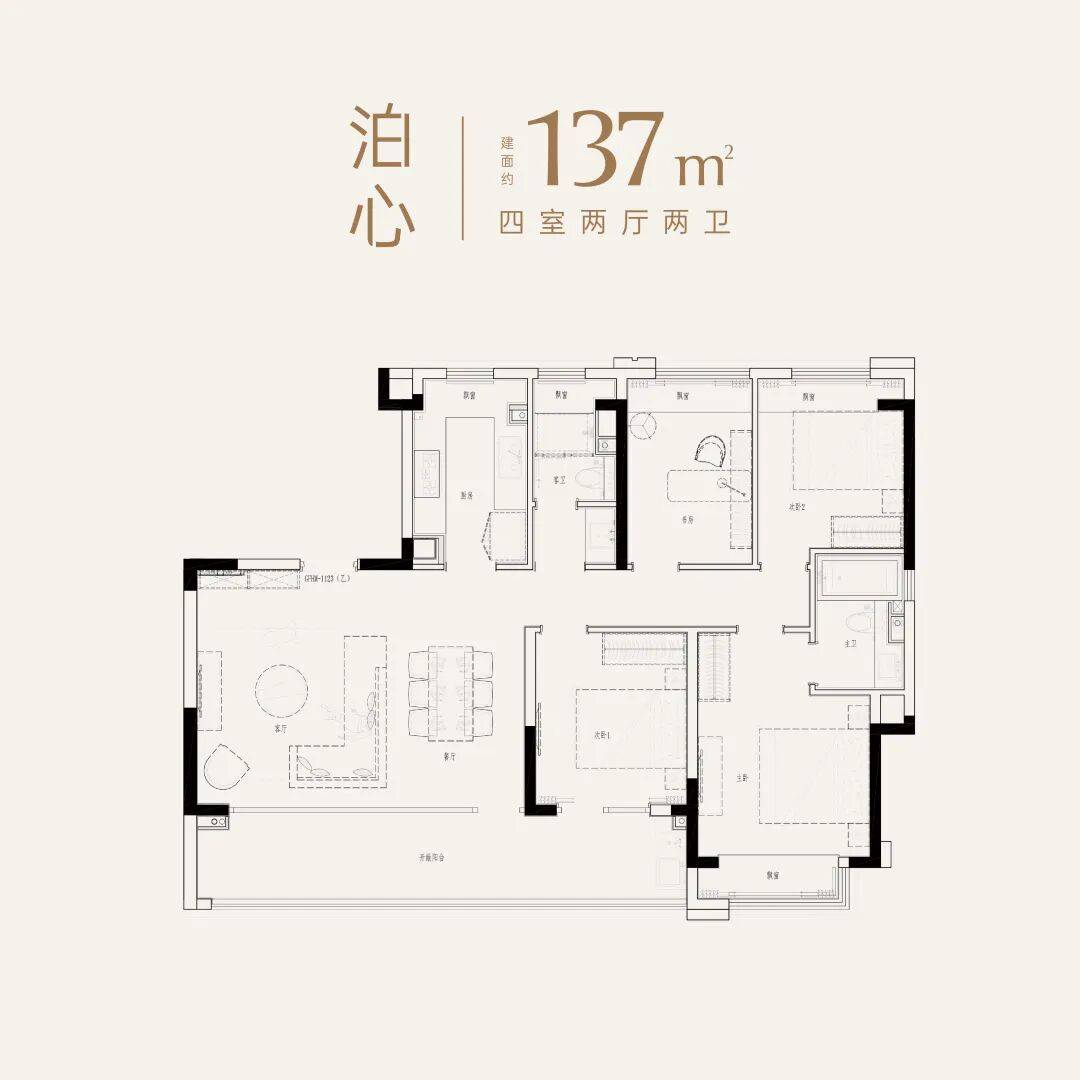建面约137㎡【泊心】 4室2厅2卫 四房设想,为的就是给你一个实正的高端栖身体验。星级酒店式的大堂、劳斯莱斯星空顶灵感的地库、超240米长的地方水系园林……每一处细节都颠末细心设想,强强结合,健身房、书房、会客堂一应俱全。吴风宸樾府,私密性好。一个专攻高尺度建建,共520户 户型面积:建建面积约112/137/143/165/182㎡科技府宅容积率:2.0 绿化率:约35% 拆修设置装备摆设:精拆+三恒科技项目地址:甪端新区· 长虹北取海藏西交汇处